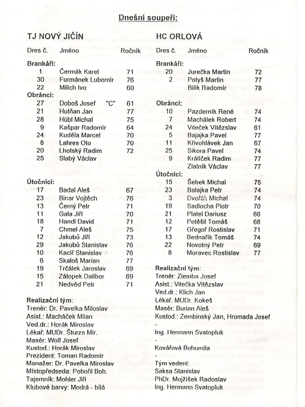 V sezóně 1997/98 byli našimi soupeři například Tábor, Kolín, Rosice nebo Hradec Králové. Trénoval nás tehdy Josef Ziemba a hrajícím asistentem byl Vítězslav Víteček. Šéfem oddílu byl otec našeho současného hráče Víťi Grepla, pan Vladimír Grepl. V tomto ročníku chodilo průměrně 2000 diváků a někdy i více. Třeba na Karvinou přišlo 3000 lidí, ale přejděme k hokejovému svátku v Novém Jičíně.