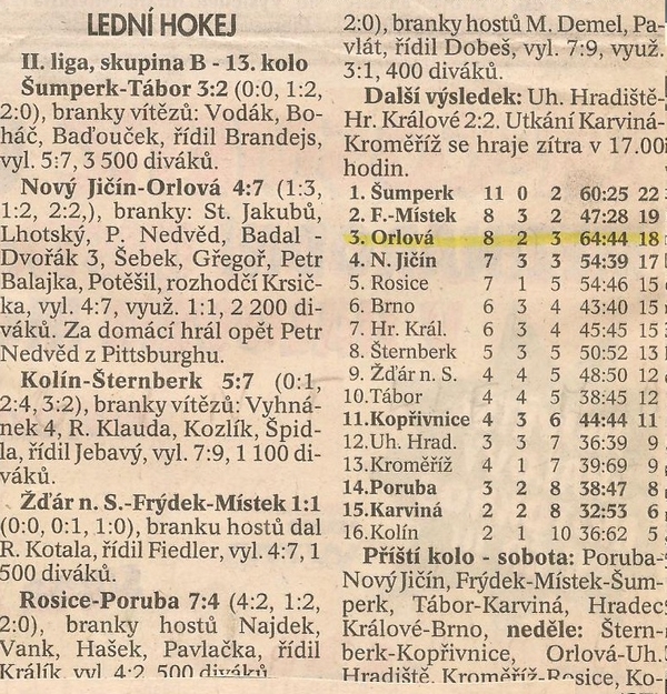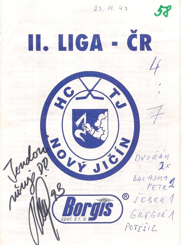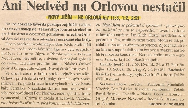 A nešlo jen o cennou zkušenost, Orlová totiž 23.11.1997 v Novém Jičíně zvítězila 4:7 a utkání přihlíželo 2500 diváků. „Oni kvůli Nedvěda přistavěli i další dřevěnou tribunu, kde se fandilo na stojáka,“ vzpomínal Jan Zembinský. „Byl to parádní zápas! Jurečka zlikvidoval 36 střel a Orlová vystřelila jenom jedenáctkrát a dala z toho sedm gólů. Kromě Martina Jurečky v brance odehrál vynikající zápas i Michal Dvořák, který dal hattrick“ dodal kustod a historik v jedné osobě. Kromě Michala Dvořáka se trefil i Petr Balajka a po jedné trefě si připsali Rostislav Gřegoř, David Šebek a současný trenér AZ Havířov Tomáš Potěšil.