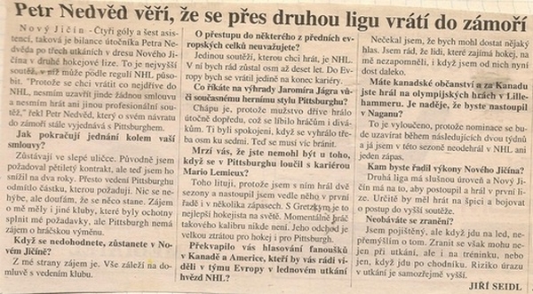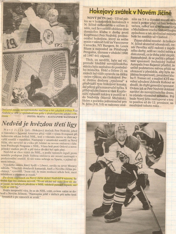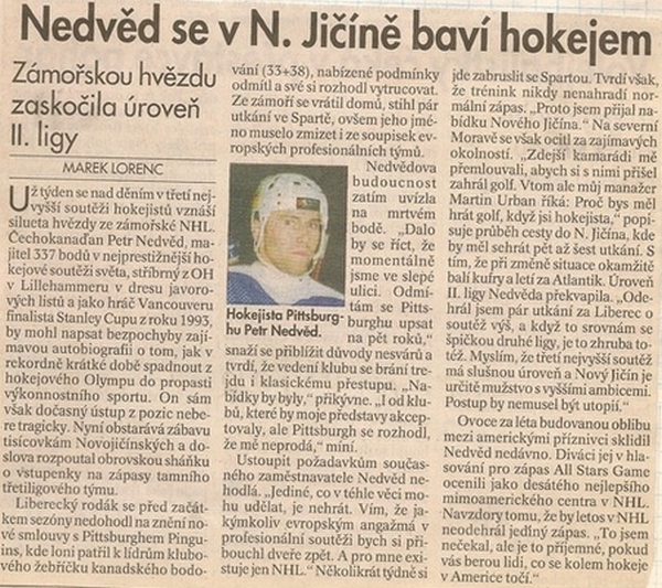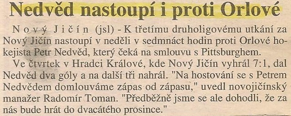 Petr Nedvěd tehdy v dobách své největší slávy patřil Pittsburghu Penguins a nedařilo se mu dohodnout se na nové smlouvě. Ne, že by o něj Tučňáci neměli zájem, právě naopak. Nabídli mu pětiletý kontrakt, jenže právě jeho délka se českému útočníkovi nezamlouvala a odmítal se na tak dlouhou dobu upsat (krásný kontrast v porovnání s dnešními dlouhodobými smlouvami). Rozhodl se vytrucovat si přijatelnější podmínky. A jelikož stále patřil Penguins, nemohl nastoupit v žádné profesionální soutěži. Proto jen trénoval na Spartě, ale shoda náhod jej zavála do Nového Jičína, kde se s vedením klubu dohodl na spolupráci v době jednání o jeho smlouvě a délka jeho působení ve druhé lize se odvíjela zápas od zápasu, ale i Orli měli to štěstí a mohli s ním změřit síly.